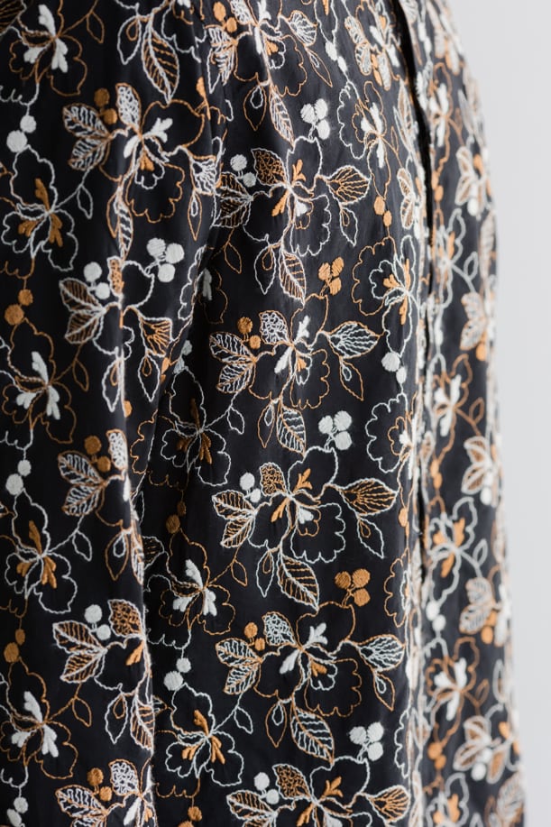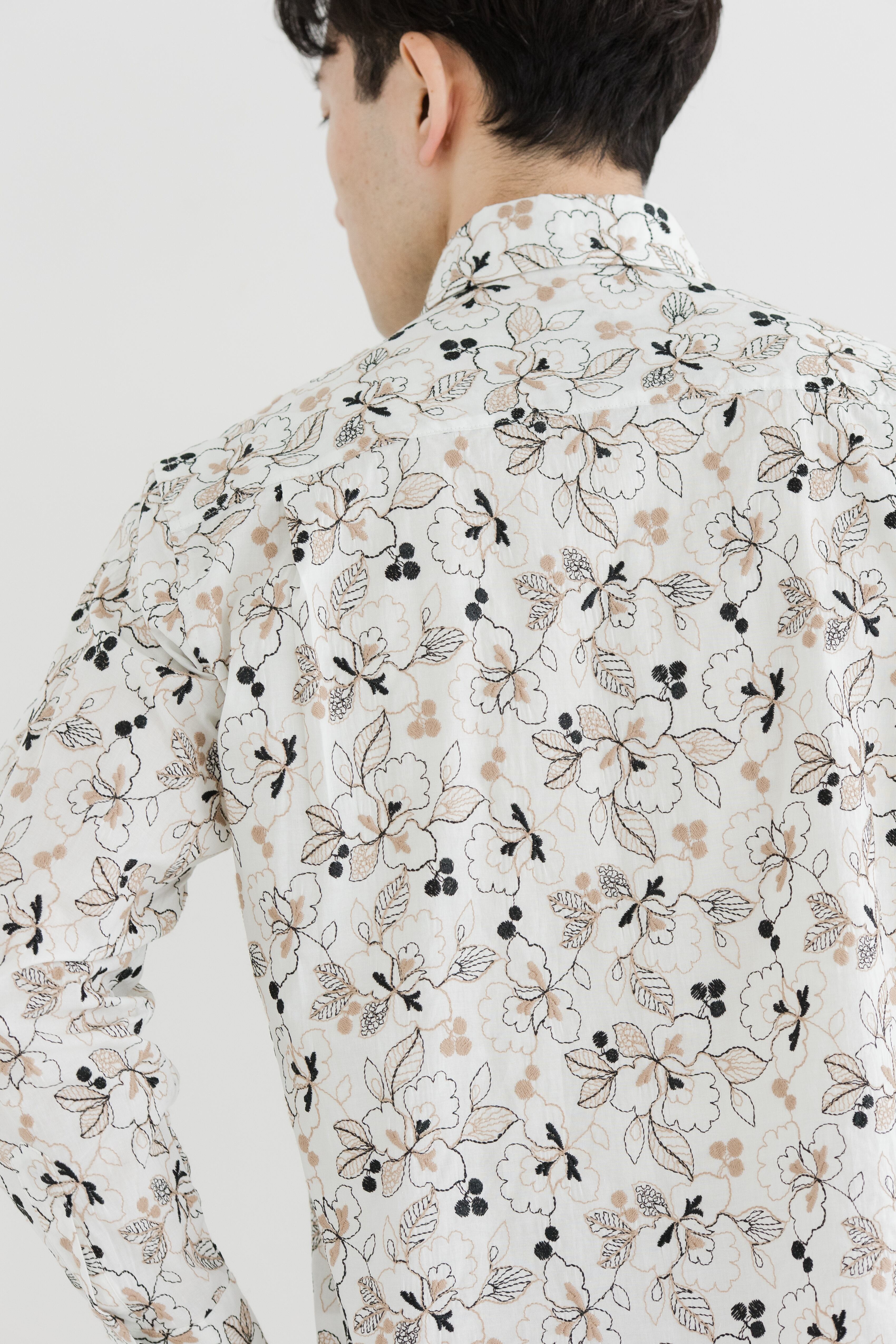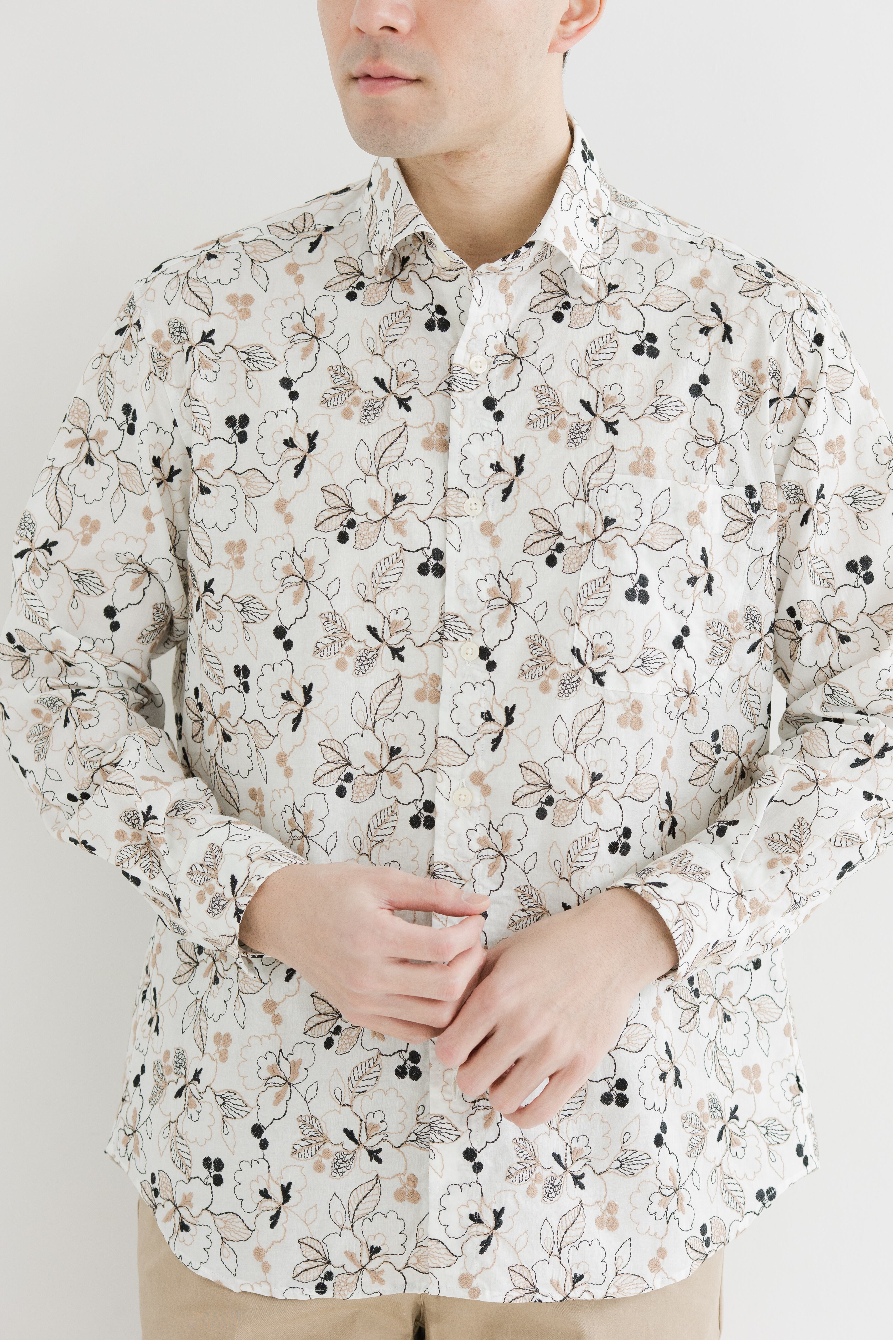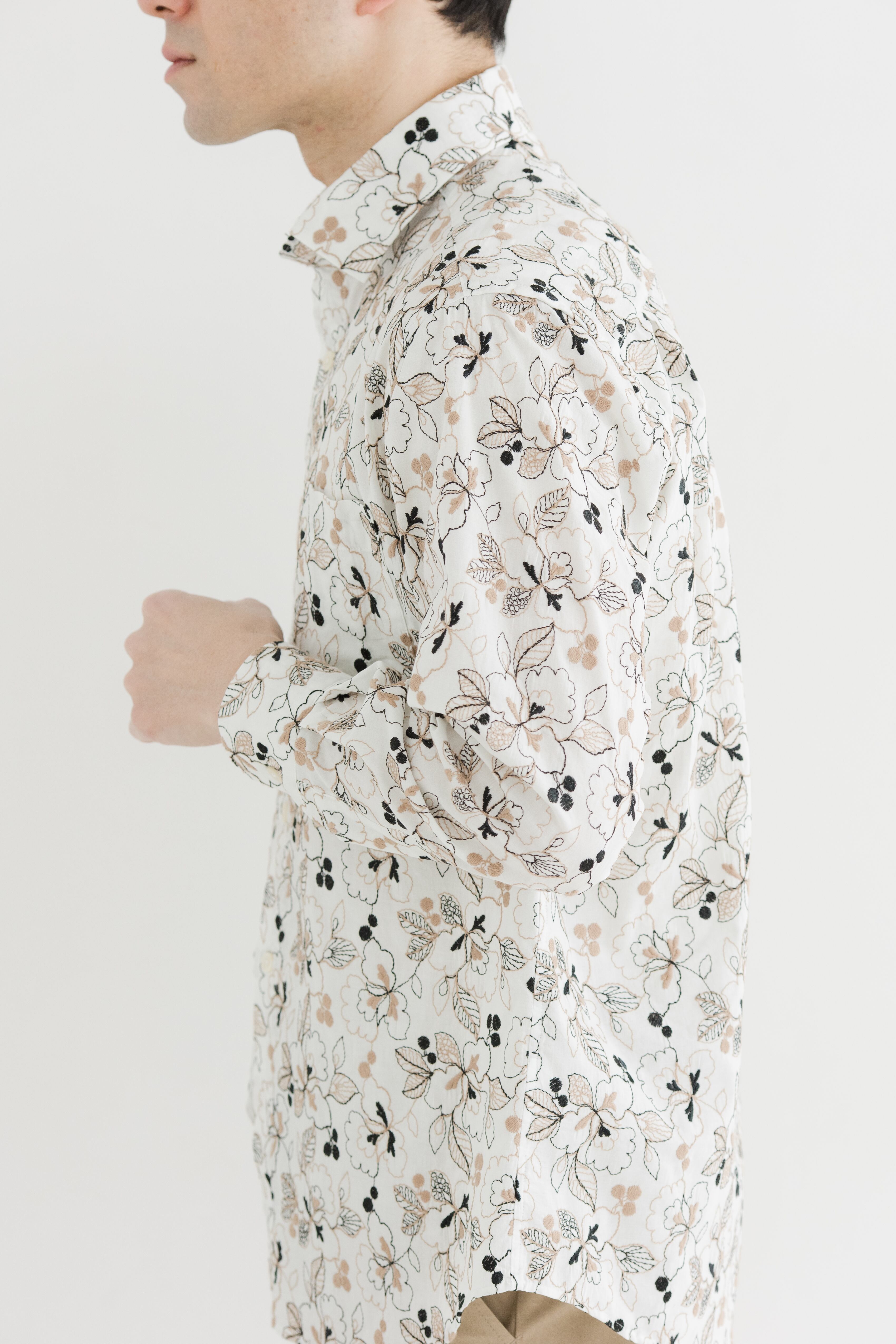 適度にハリ感のある無地ローンの生地にレース刺繡を総柄で施したワイドカラーシャツ。